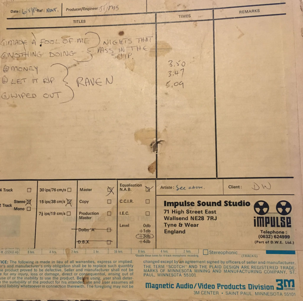 And that was that. The songs never saw the light of day. And then I spotted them: they’re on the same tape reel as the Raven audition tape. I’m about to digitise this before shipping off to John Gallager in Florida. Perhaps these recordings will join my archive stuff going out on Vainglorious UK